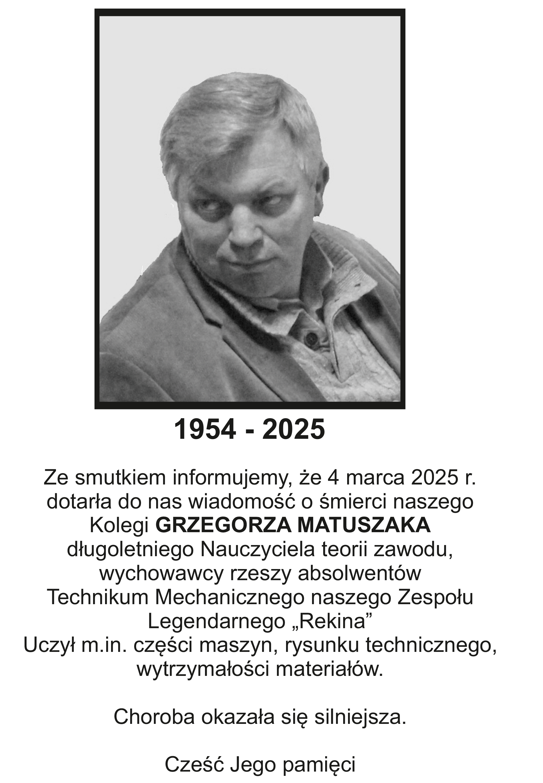 Ze smutkiem informujemy, że 4 marca 2025 r. dotarła do nas wiadomość o śmierci naszego Kolegi GRZEGORZA MATUSZAKA długoletniego Nauczyciela teorii zawodu, wychowawcy rzeszy absolwentów Technikum Mechanicznego naszego Zespołu Legendarnego „Rekina”. Uczył m.in. części maszyn, rysunku technicznego, wytrzymałości materiałów.